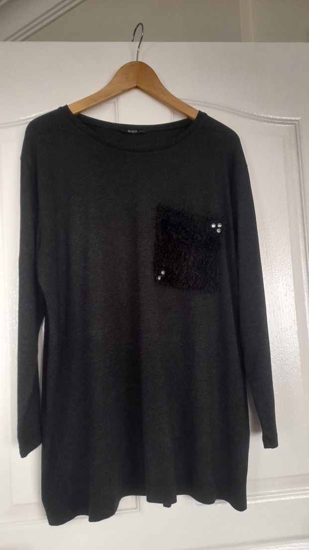 Siyah renkli, uzun kollu, yuvarlak yaka ve gevşek kesime sahip triko kazak. Kürk detaylı cep ile rahat ve şık bir görünüm sunar.