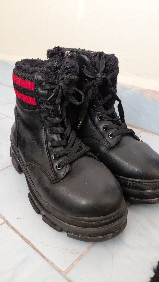 Siyah kauçuk kadın botu, kürk detaylı ve çizgili tasarıma sahip. Kalın topuklu ve bağcıklı, günlük rahat stil için uygun.