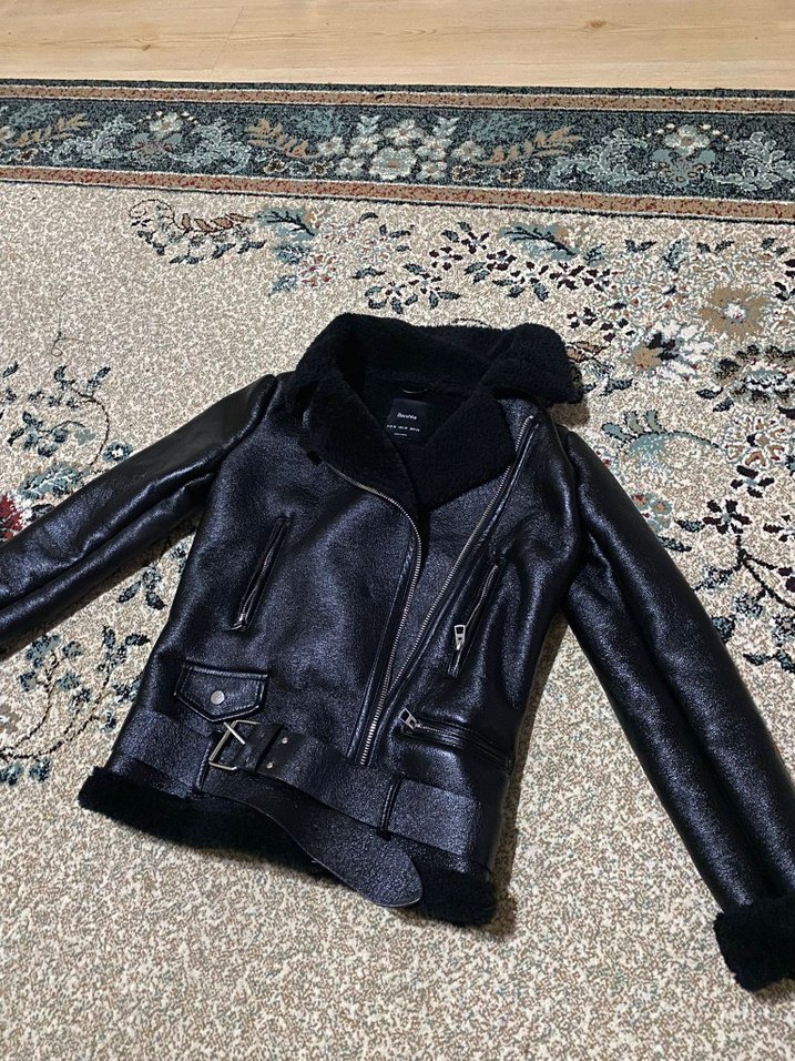 Siyah deri biker ceket, kürk detaylı ve fitted kesimlidir. Notch yaka, midi boy ve askılı kollara sahiptir, rahat kullanım için uygundur.