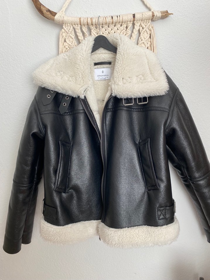 Kürklü detaylı siyah deri biker ceket, askılı kollu ve yaka detayı ile. Rahat kesim ve kısa boyda, trend günlük stil için uygun. Hiç kullanılmamıştır. Tam kalıptır