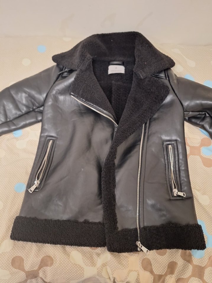 Siyah deri biker ceket, uzun kollu, kürk detaylı yaka ve etek ucu ile rahat ve şık. Normal midi boyda, günlük kullanıma uygun, fit kesim.