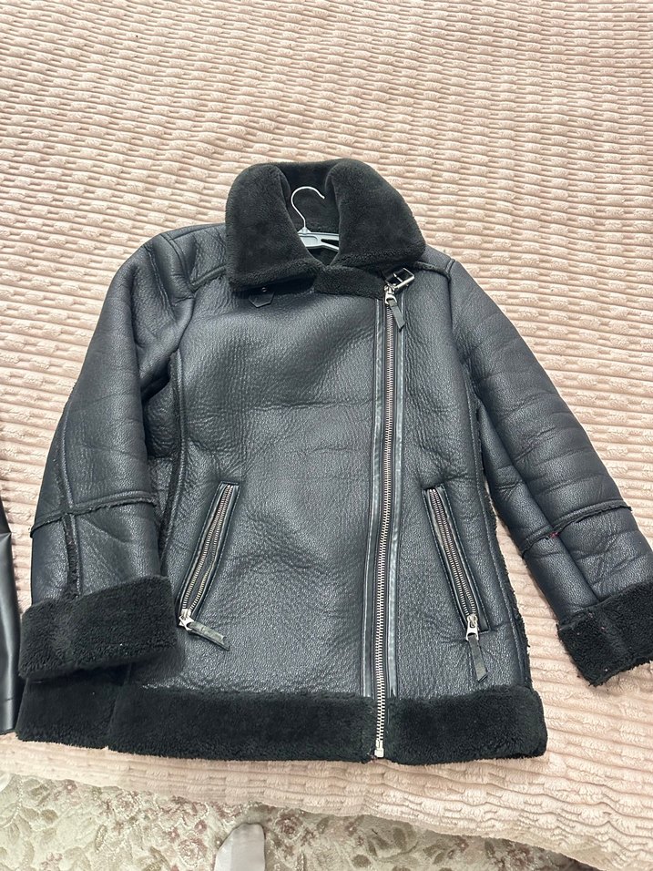 Siyah deri biker ceket, yakada, manşetlerde ve etek ucunda kürk detaylıdır. Gayet kullanışlı.