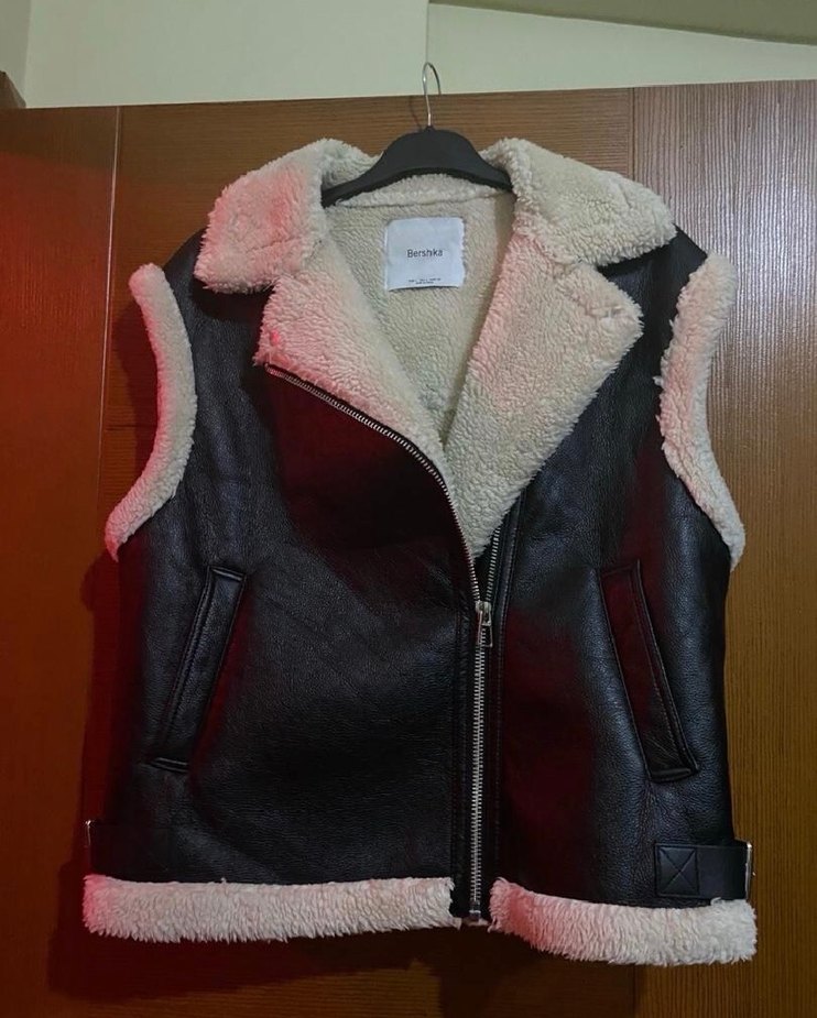 Siyah deri, kolsuz biker yelek, rahat kürk detaylı, straplez yakalı ve vücuda oturan kesimiyle trend casual tarzda.