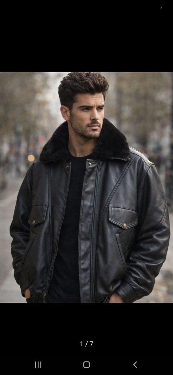 Siyah deri erkek ceket, kürklü detaylı, kesik yaka ve uzun kollu. Günlük sokak stili için uygun, normal kesim.