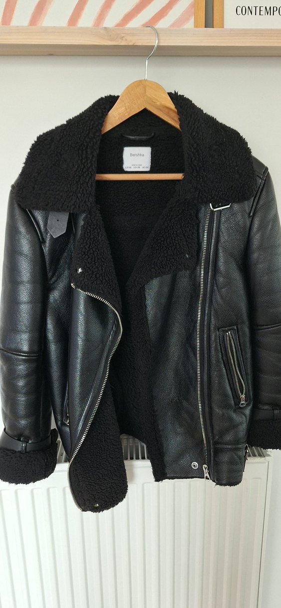 Siyah deri, kürklü astarlı, keskin yakalı ve dar kesimli kadın biker ceketi, şık ve rahat bir tarz sunar.