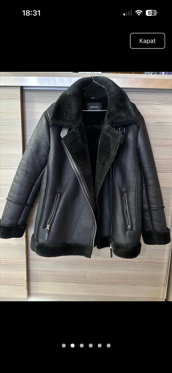 Siyah deri biker ceket, kürklü yaka, manşet ve etek ucu detaylarına sahiptir. Notch yaka ve askılı kollarıyla midi boyda, şık ve desenizdir.