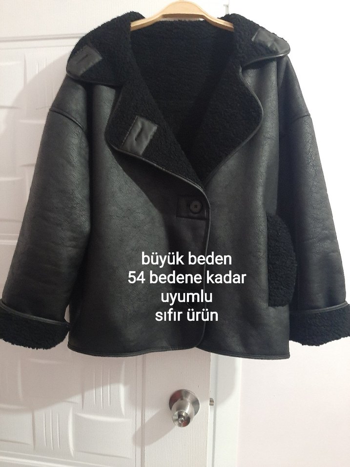 Siyah, kısa kesim deri kadın biker ceket, kürk detaylı ve notched lapel yaka ile rahat bir kesime sahiptir. 54 bedene kadar uyumludur.