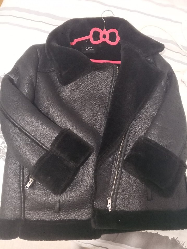Siyah deri, kürklü detaylı, dik yakalı, bilekten fermuarlı ve normal boyda biker ceket. Rahat ve şık bir görünüm sunar. l beden 1 kere giyidli hiç bir seyi yok beden büyük geldiği için satıyorum