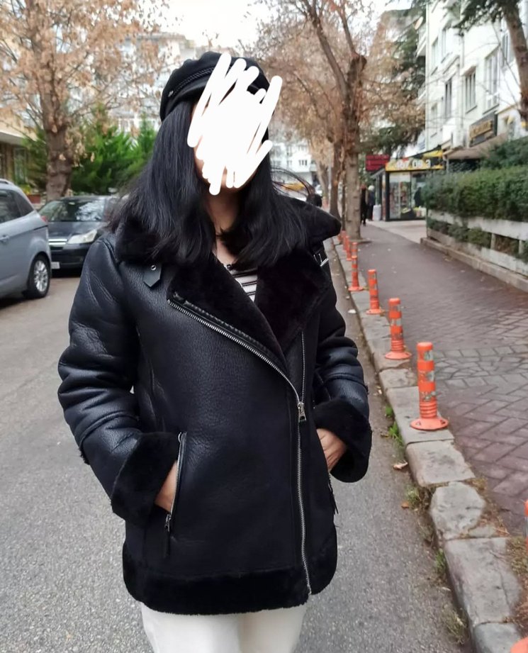 Siyah, kürklü detaylı, deri, uzun kollu, kesimli kadın ceket. Midi boy, günlük ve sokak stili için uygun.