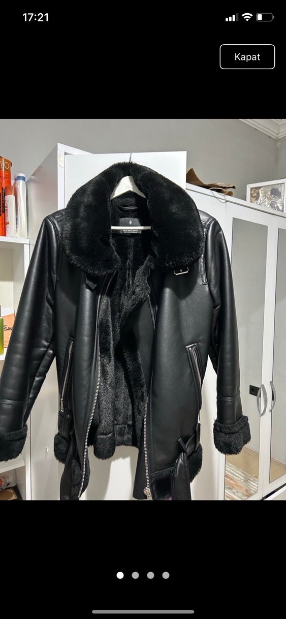 Siyah deri ceket, kürklü yakası ve manşetleri.