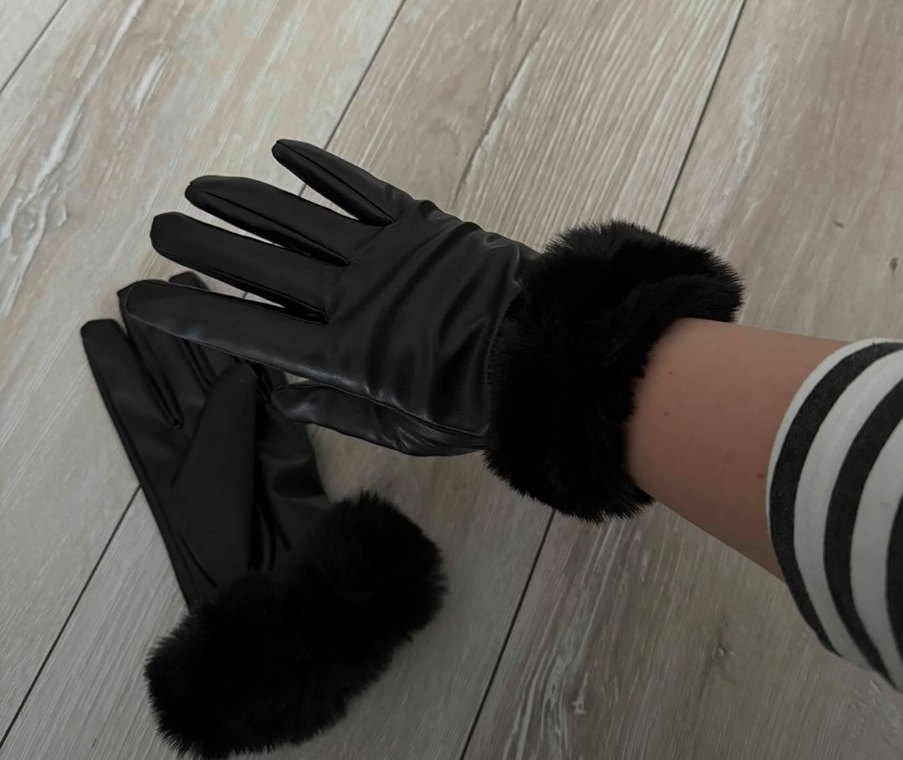 Bilek kısmında kürk detaylı siyah deri eldiven, rahat ve modaya uygun gotik tarz sunar. Trend belirleyenler için avant-garde bir seçim.