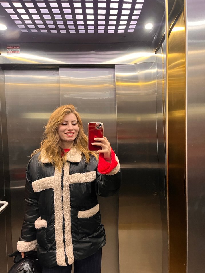 Siyah deri, uzun kollu, yüksek yakalı ve kürk detaylı kadın kışlık ceketi. Midi boy, gençler için sokak stili uyumlu.
