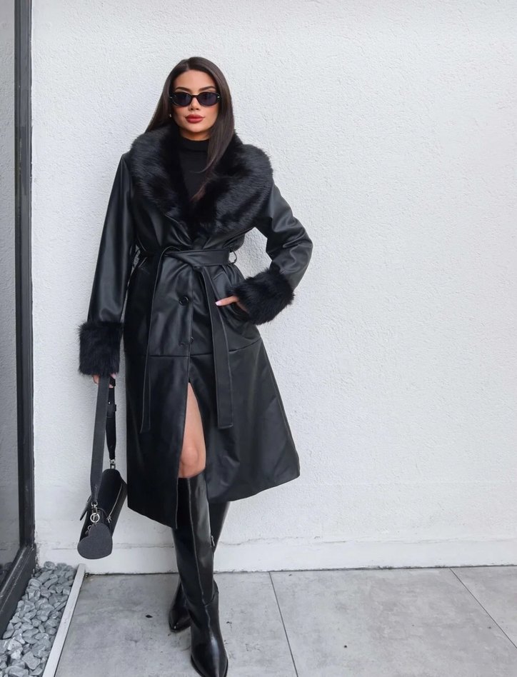 Siyah deri trençkot, kürklü yaka ve manşet detaylarına sahip. Uzun boy, kuşaklı ve regular fit ile günlük şık street style görünüm sunar.