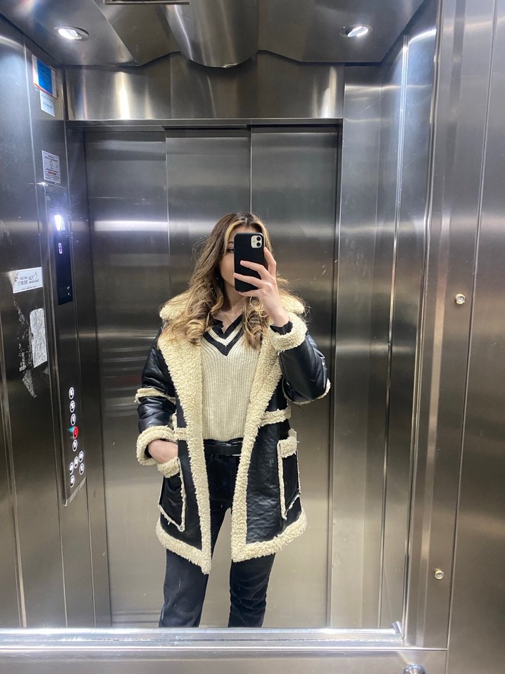 Siyah deri midi ceket, yakada, manşette ve ceplerde kürk detayına sahiptir ve aşırı sıcak tutar . Geniş kesim, kesik yaka ve uzun kolludur, sokak stili için uygundur.