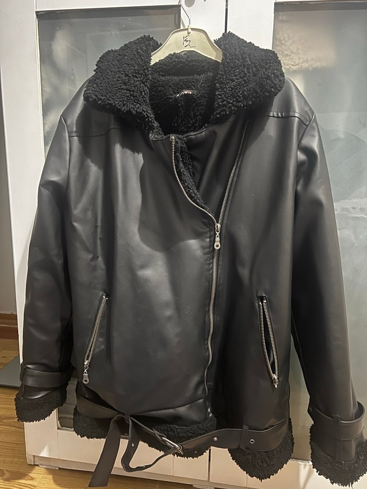 Kürklü detaylı, siyah deri biker ceket. Notlu yaka, bol kesim ve fermuarlı ceplere sahip