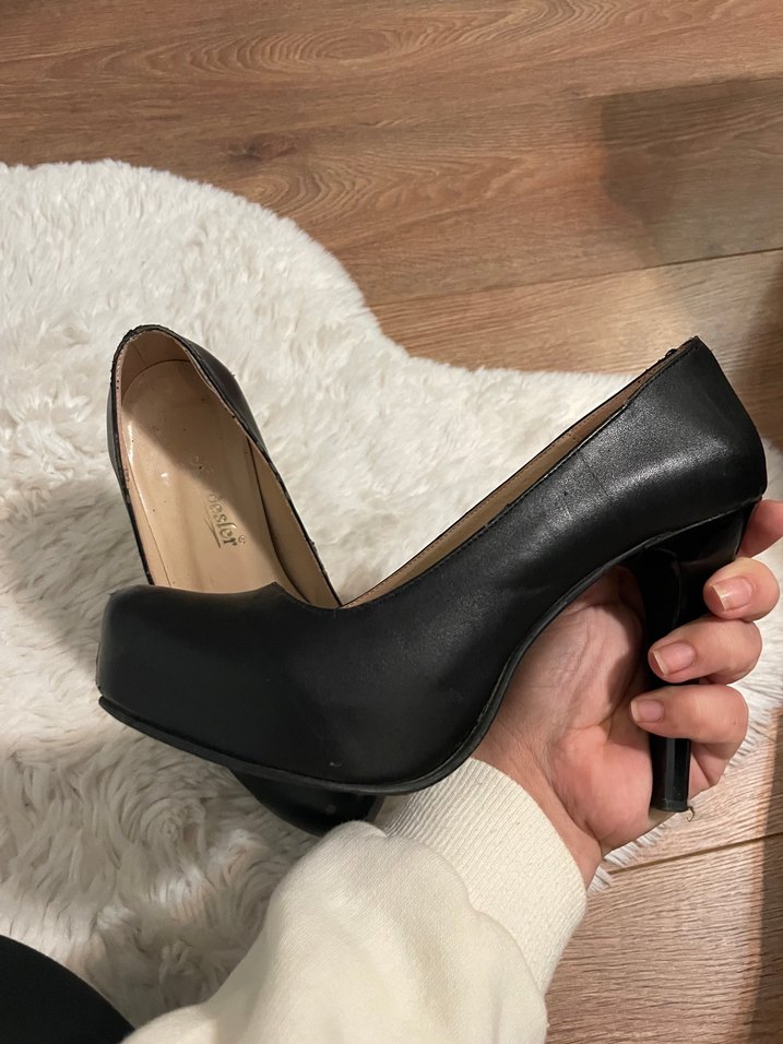 Klasik gotik tarzda, kürklü detaylara sahip siyah deri stiletto. Ofis için uygun, cesur bir görünüme sahip. Bir kaç yerinde soyulma gibi deforme vardır