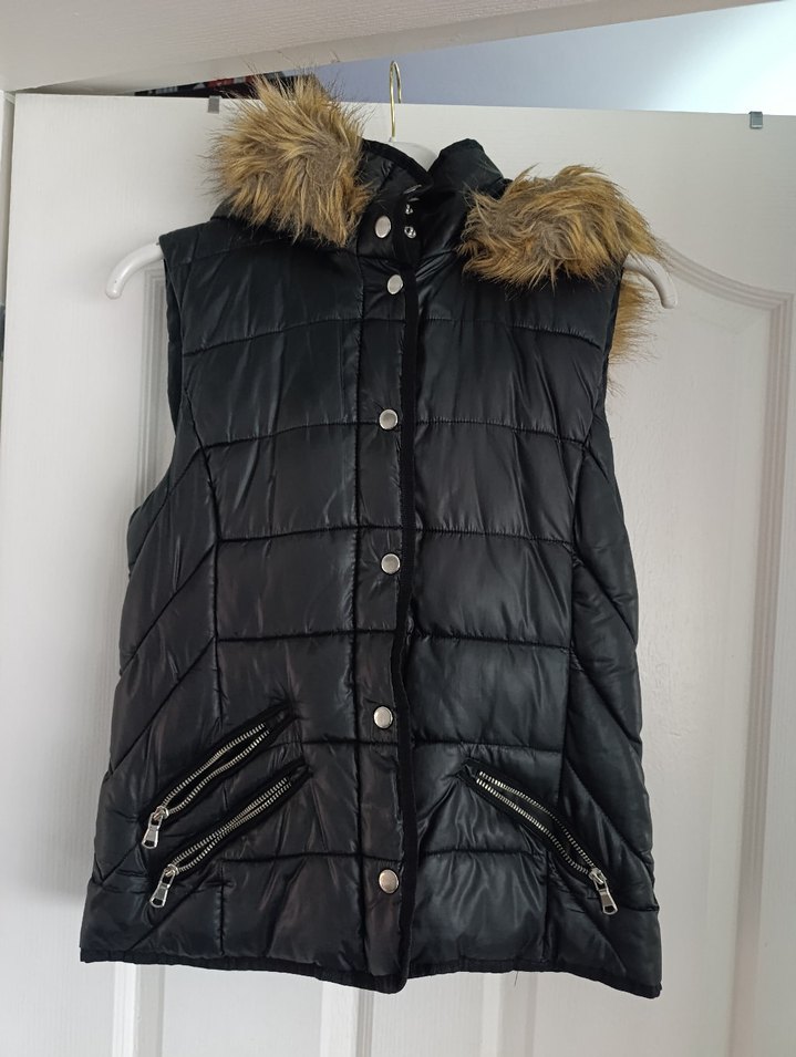 Siyah, kolu olmayan, yakalı ve sentetik kumaştan yapılmış, kürk detaylı, düğmeli, normal midi uzunlukta, fermuarlı cepleri olan, trend sokak stili kadın yeleği.