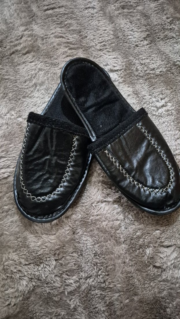 Kürklü detaylara sahip siyah erkek ev terliği. Yumuşak iç yüzeyi ve dikişli detayları ile konforlu kullanım sunar.