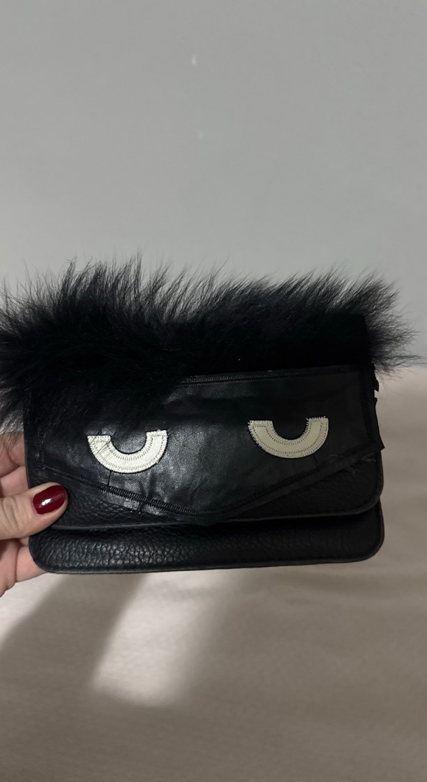 Siyah deri el çantası, işleme gözler ve kürk detaylıdır. Gotik tarzda, parti için uygun, rock punk havası ve avant-garde dokunuş taşır.