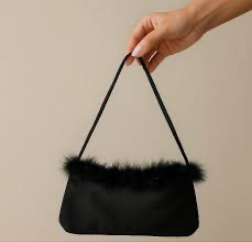 Siyah renkte, kürk detaylı, minimalist gotik tarzda kadın çantası. Sentetik kumaştan yapılmıştır, romantik akşamlar için şık ve trend bir seçim.