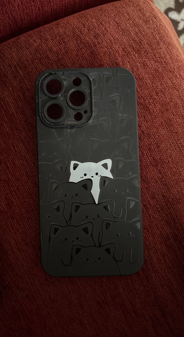 Kürklü detaylara sahip siyah gotik telefon kılıfı, koyu renkli kediler ve ortada beyaz bir kedi deseni içerir.
