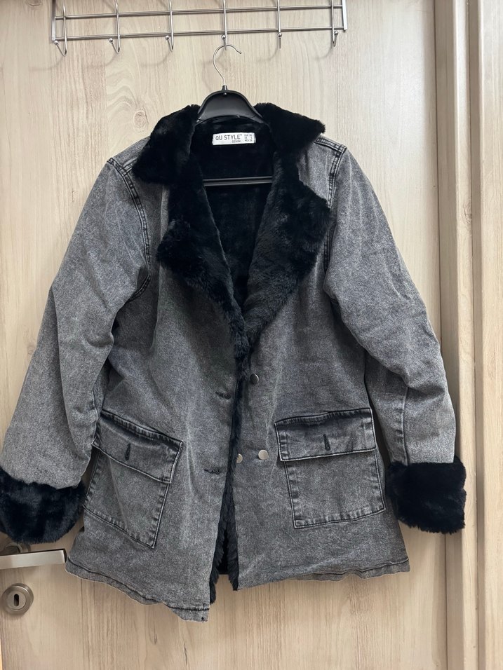 Gri denimden yapılmış, yakası,içi ve kolları kürklü, bol kesim, normal uzunlukta kadın ceket. Notched lapel yaka ve uzun kolludur.