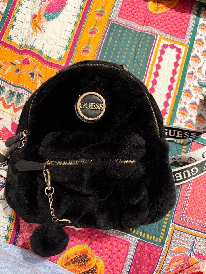 Siyah kürklü Guess sırt çantası, ön fermuarlı cep ve ponponlu aksesuar içerir. Bağlantılı bağlama kayışıyla rahat ve sokak stilini birleştirir. Günlük kullanıma uygun.