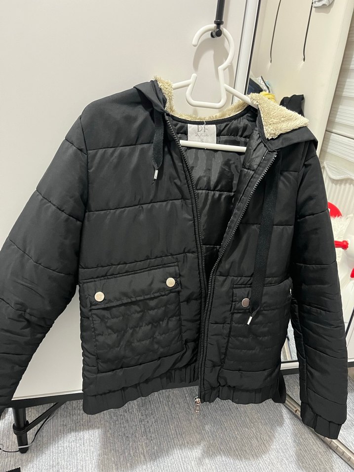 Siyah renkli, kürk detaylı ve yumuşak dokulu kumaştan yapılmış, uzun kollu, normal uzunlukta, günlük kullanıma uygun ince kesim kadın mont.