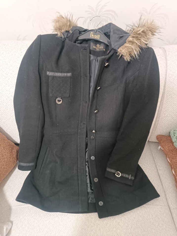 Siyah, kürklü kapüşonlu, notched lapel yakalı, uzun kollu, midi boy, hamilelere uygun, rahat ve sıcak dokulu kaban.