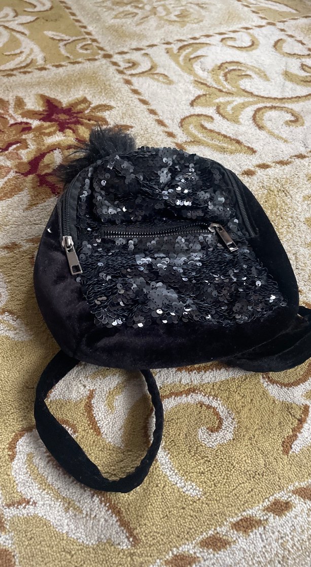 Siyah renkte, kürklü ve işlemeli pullarla süslenmiş sentetik kumaştan kadın sırt çantası. Gotik ve bohem tarzı bir arada sunar, günlük kullanıma uygundur.