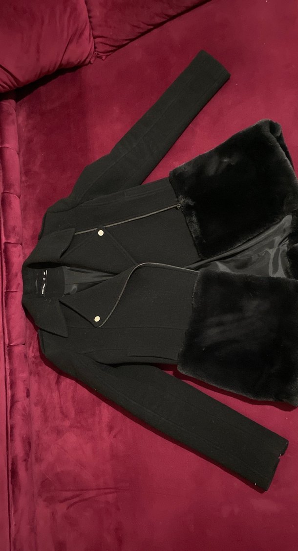 Yumuşak siyah kürk detaylı, fermuarlı ve düğmeli siyah kaban.