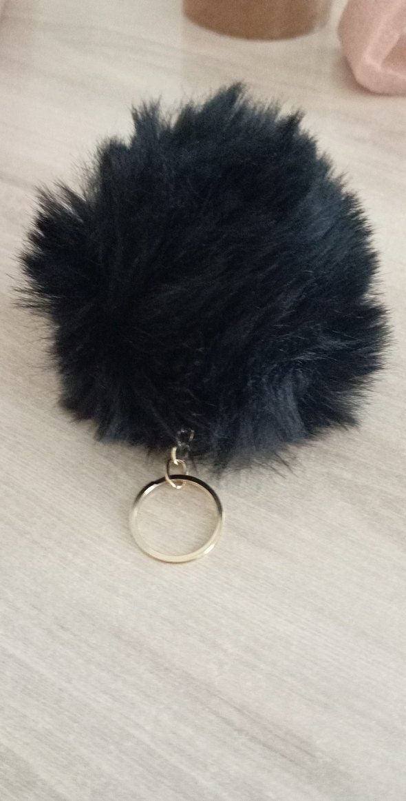 Yumuşak kürk detaylı siyah anahtarlık, metal halka ile sade ve rahat gotik tarzda.