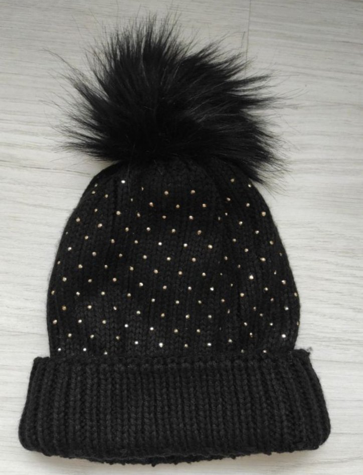 Küçük metal detaylar ve kürk ponpon süslemeli siyah örgü kadın bere, rahatlık ve gotik tarzı bir araya getirir. Boncukları biraz sarardı. Bunun dışında sorunu yok.