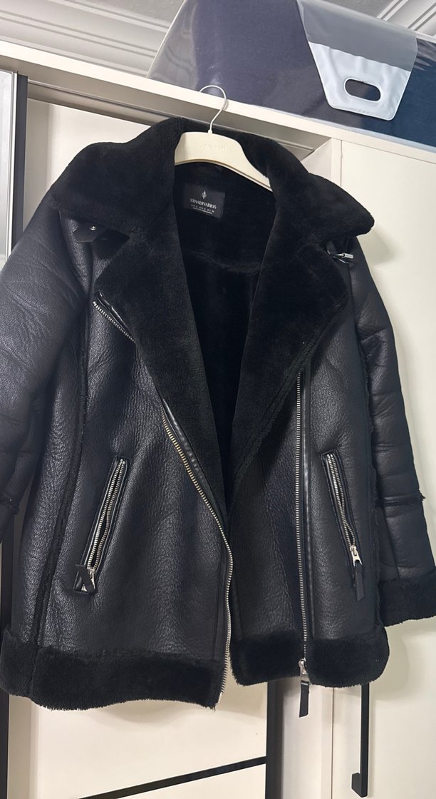 Bu siyah deri biker ceket, kürk detayları, kesik yaka ve vücuda oturan kesime sahiptir. Askılı kollu ve midi boydadır, günlük kullanım için uygundur.
