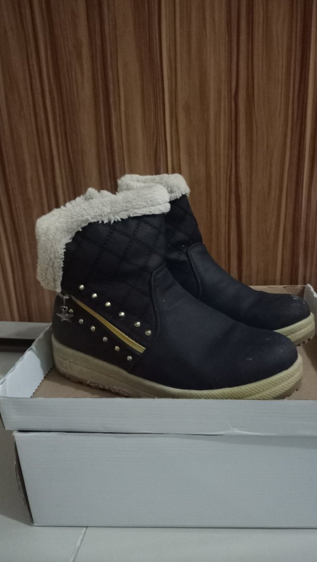 Siyah kauçuk dolgu topuk botlar, kürk detayları ve metal süslemelerle günlük rahat sokak stili için uygundur. 38