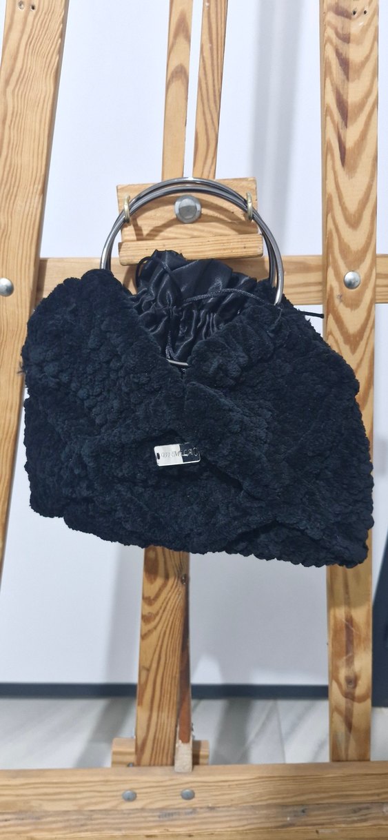 Siyah renkli, kürklü dokusu ve metal halka sapıyla rahat ve gotik tarzı bir araya getiren kadın el çantası.