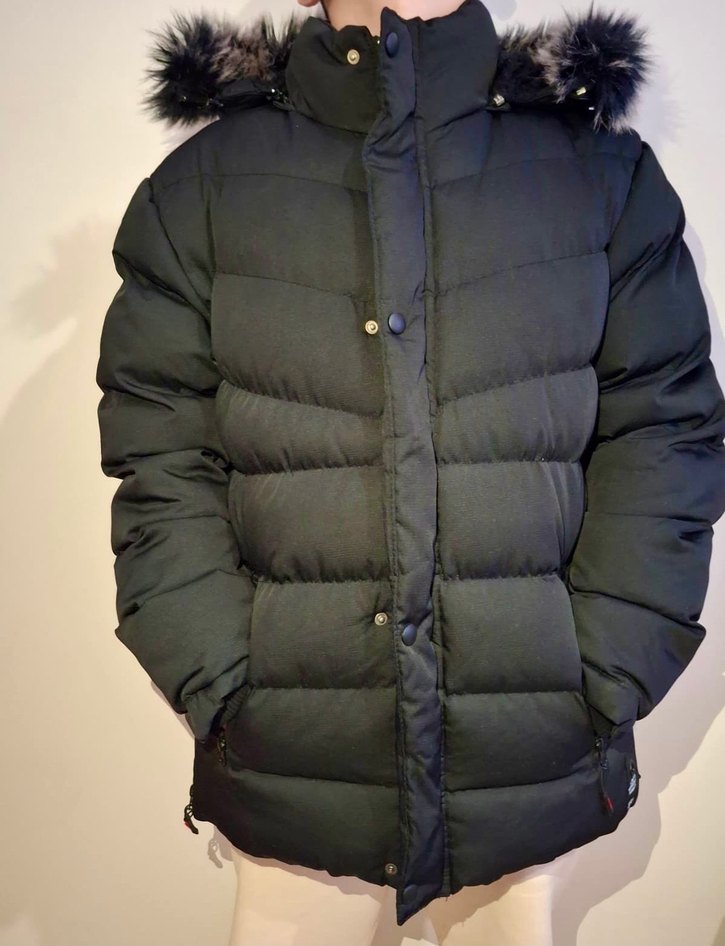 Siyah, kürklü kapüşonlu, uzun kollu, diz hizasında, rahat kesim kadın/erkek kışlık mont. Yumuşak ve sıcak kumaştan ürünün herhangi bir hasarı yok giyilmedi
