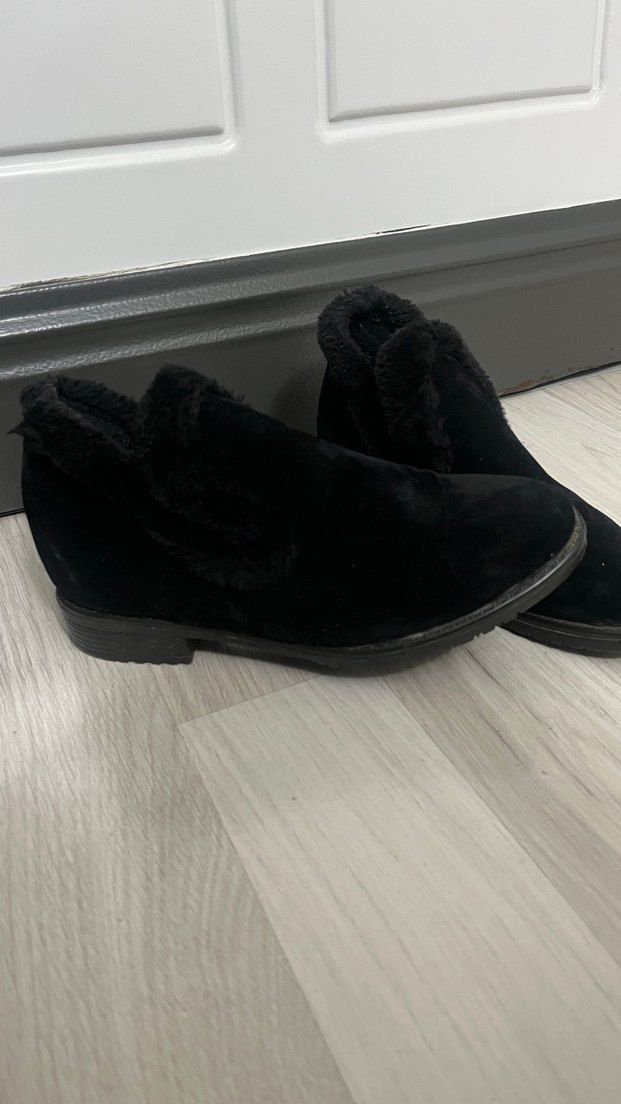 Sadece 1 kez giyildi çok rahat vurma vs yapmaz. Siyah, kürklü detaylı, blok topuklu kadın botları. Yumuşak kumaştan, desen içermeyen bu botlar günlük rahat tarz için uygundur.