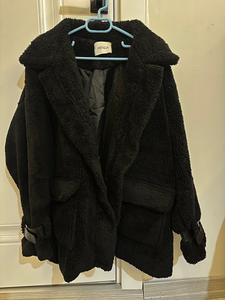 Siyah peluş, notched lapel yaka ve uzun kollu. Rahat ve bol kesim, günlük kullanıma uygun, sıcak ve şık bir sokak tarzı kaban.