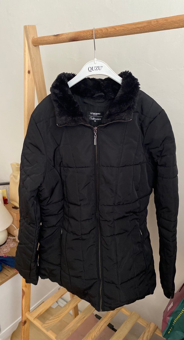 Siyah, kısa tüylü yakalı, uzun kollu, orta boy, yumuşak ve sıcak dokulu kadın kışlık cekettir. Rahat sokak stili için uygundur.
