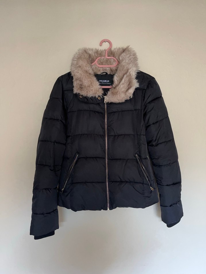 Fitted kesim siyah kışlık ceket, kürklü yakaya ve askılı kollara sahiptir. Yumuşak ve sıcak kumaştan üretilmiş, günlük kullanıma uygun normal midi boyda bir modeldir. Kusursuz kaliteli bir mont dar kalıp xs s bedenler tercih edebilir.