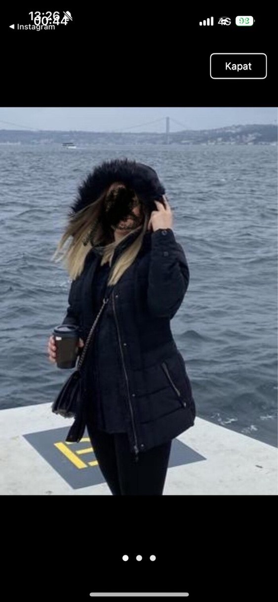 Siyah, kürklü kapüşonlu, yüksek yakalı, uzun kollu, midi boy, rahat kesim kadın kışlık monttur. Yumuşak ve sıcak kumaştan üretilmiştir.