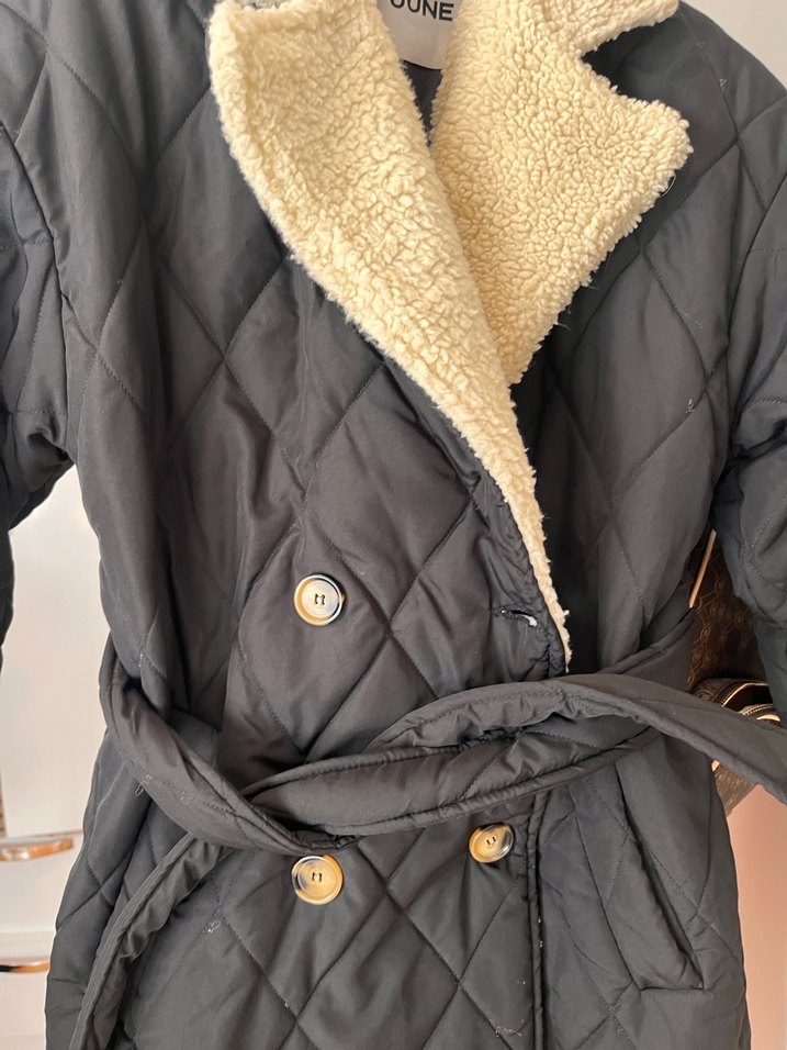 June marka Kadın kışlık mont, kürklü detaylı ve yumuşak sıcak fleece astarlı. Notch yaka ve askılı kollu, rahat kesim ve midi boyda, günlük sokak stili için uygun.