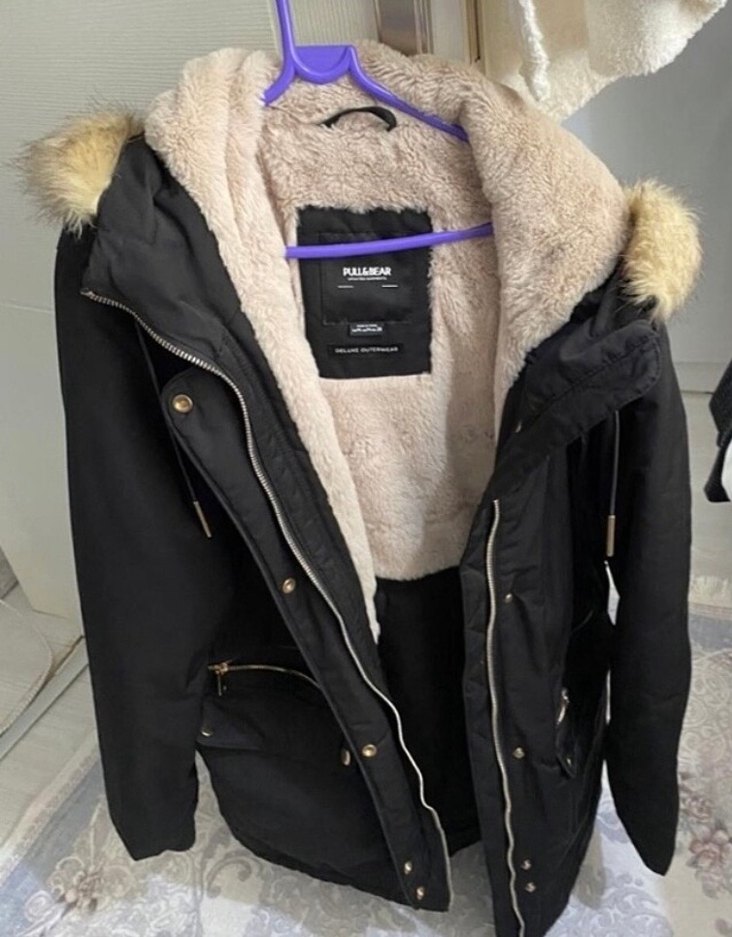 Siyah, kürklü kapüşonlu, uzun kollu, normal boyda kadına özel kışlık mont. Yumuşak ve sıcak fleece astar içerir, rahat sokak giyimi tarzına uygundur.