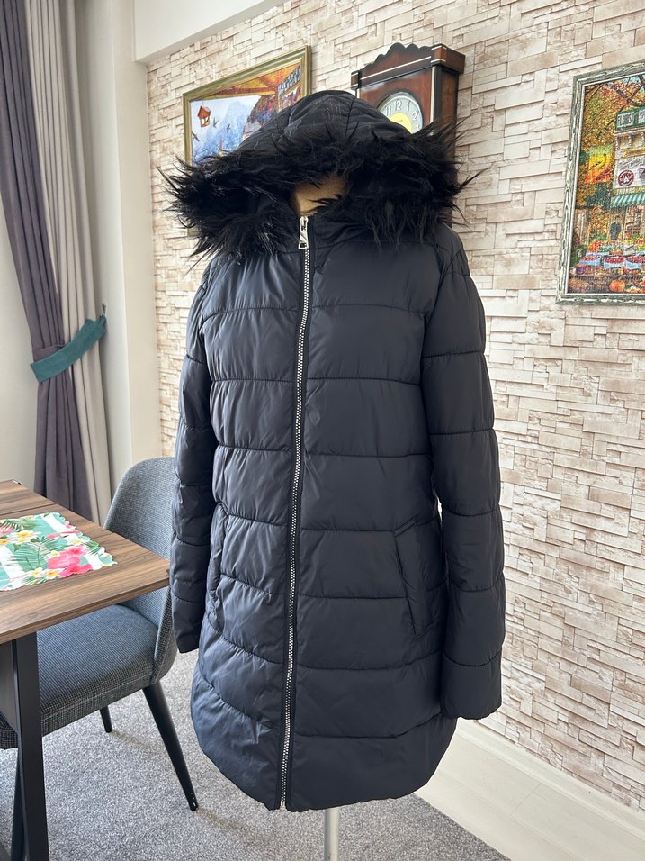 Siyah renkte, kürklü kapüşonlu, yüksek yakalı ve vücuda oturan kesime sahip kadın kışlık mont. Normal midi boyda, askılı kollu, yumuşak ve sıcak kumaştan üretilmiştir.