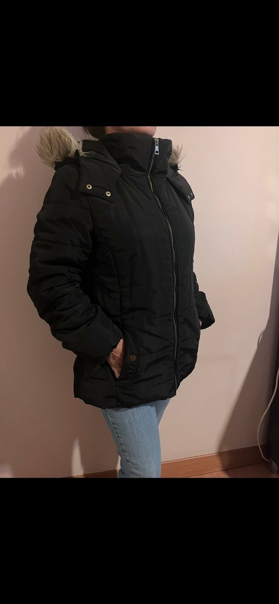 Siyah, kürklü kapüşonlu, uzun kollu, sokak stili uyumlu, normal boyda, yumuşak ve sıcak kumaştan kadın kışlık mont.