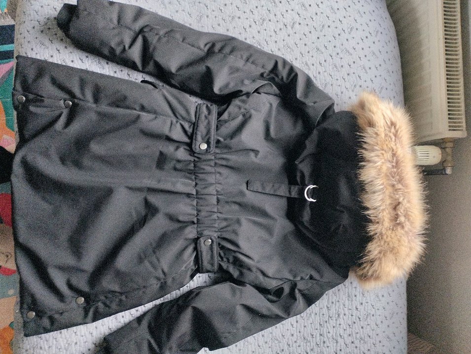 Kadınlar için kürklü detaylı, yakalı ve vücuda oturan siyah kışlık mont. Sentetik kumaştan, midi boy ve askılı kollu, rahat sokak stili için uygun.