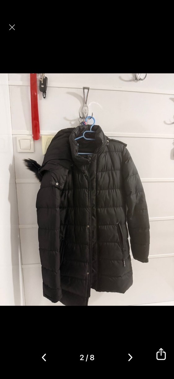 Siyah, kürklü detaylı, uzun kollu ve yüksek yakalı, midi boy kadın kışlık mont. Sıkı kesimi ve rahat dokusuyla dış mekan için uygun, sokak stili bir parça.