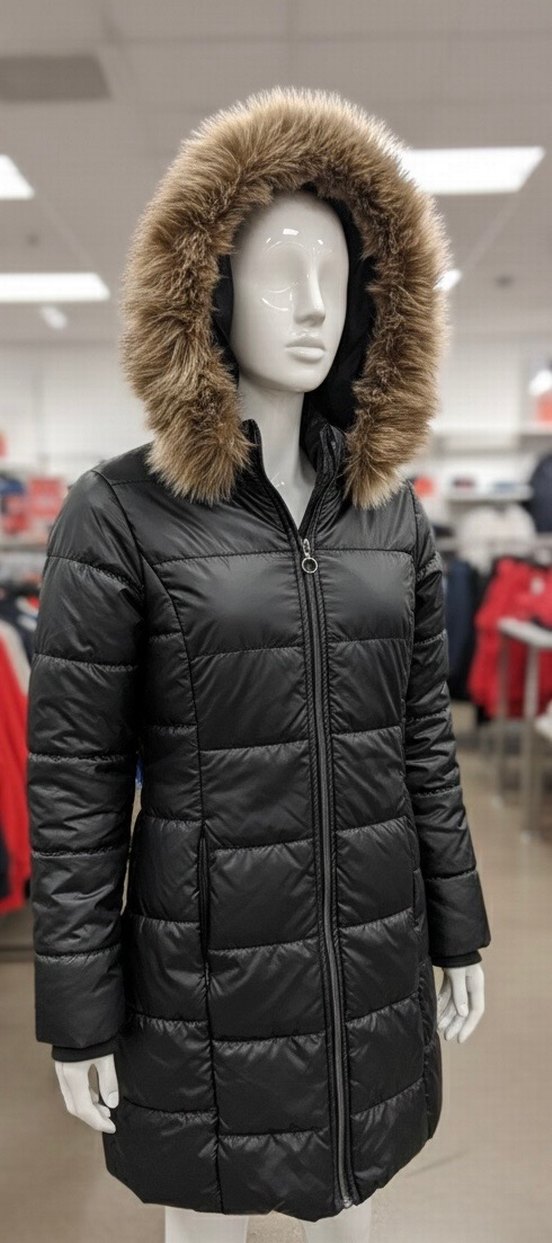 Siyah, kürklü kapüşonlu, sentetik kumaştan kadın kışlık mont. Normal midi boyda, uzun kollu ve fitted kesim, sokak stili ve rahat bir görünüm sağlar. ❄️