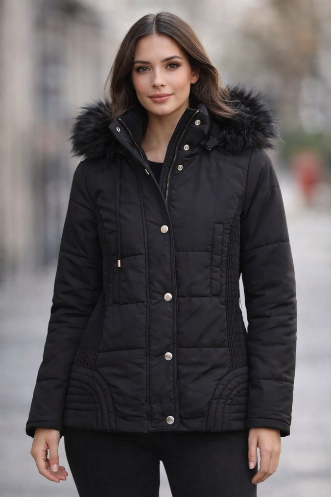 Siyah renk, kürk detaylı kapüşonlu, normal boy, kadın kışlık mont. Kürk çıkabilir düğmelidir. Çok az kullanıldı yeni gibidir.